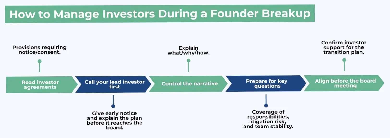 Then have the conversation. Call your lead investor before anything becomes public. Explain what's happening, why, and what the plan is. Be direct. Investors know co-founder departures happen. What they're assessing is whether the remaining team can execute and whether the departure signals deeper problems.