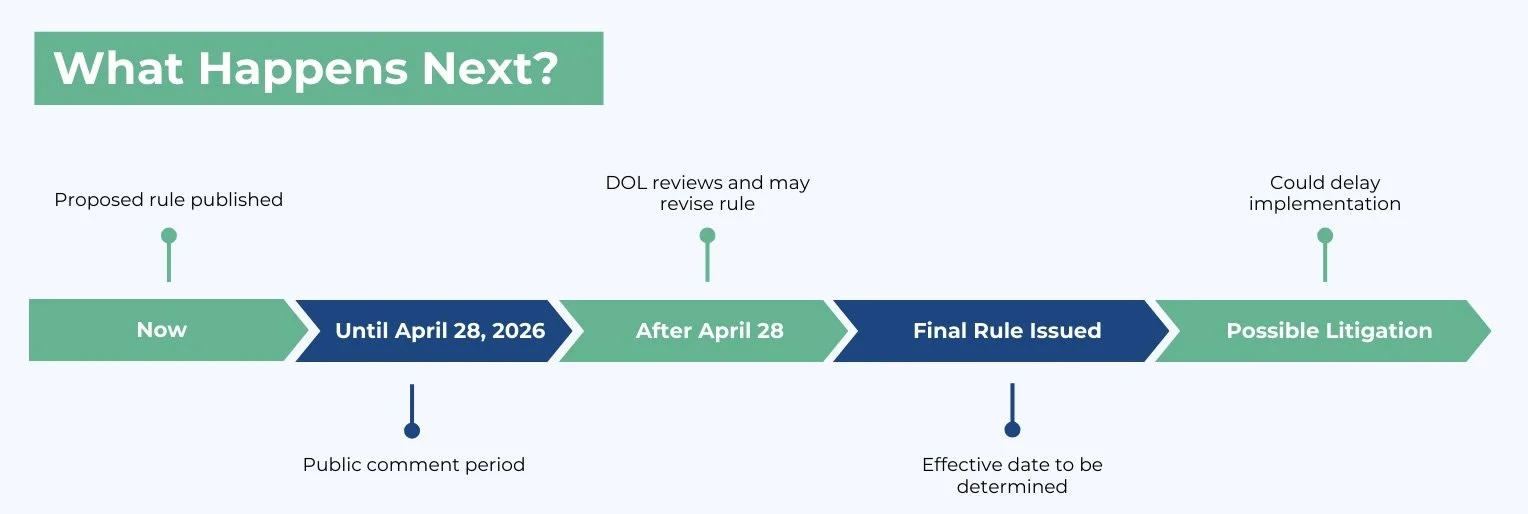 The proposed rule is not in effect yet, and the public comment period goes through April 28, 2026. The DOL will then review comments and consider revisions to the rule before publishing a final rule with an effective date. Any final rule could face legal challenges in court that could delay implementation. We will continue to provide updates on developments.