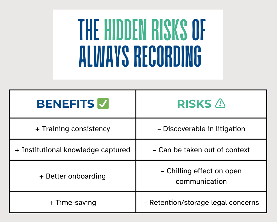 Focus on intentionality over convenience. Being selective about what and when you record doesn’t just reduce legal risk. It also helps preserve a culture of trust and candor.